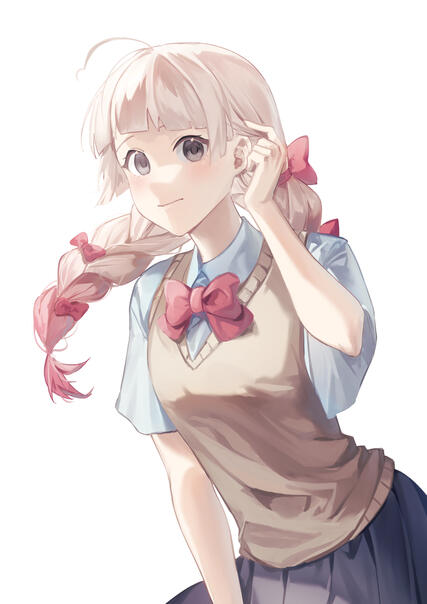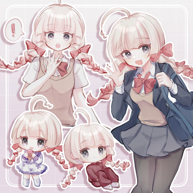 ✾ 齊瀏海,一點點公主切,米白色的頭髮(#FFF6EF)下半部漸變染成粉色(#E8869C),鬆鬆大大的辮子(長度為胸口上下,不及腰)上面夾著許多小蝴蝶結裝飾,呆毛看起來像倒3的形狀。✾ 黑色的眼睛。✾ 制服一年四季都穿著整件式的黑絲襪,冬天是制服外套和長袖毛衣、夏天是無袖毛衣背心。不喜歡單穿襯衫。